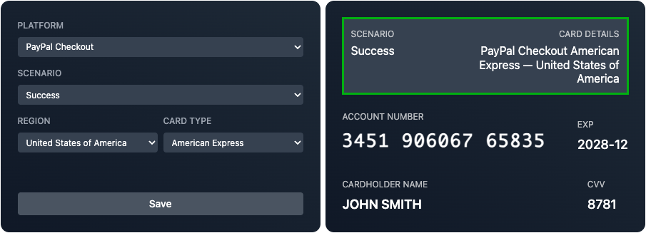 You can use the Credit Card Generator tool provided by PayPal to generate a valid card for your PayPal wallet. Ensure that the "Platform" is set to "PayPal Checkout" in settings by clicking the area highlighted in green.