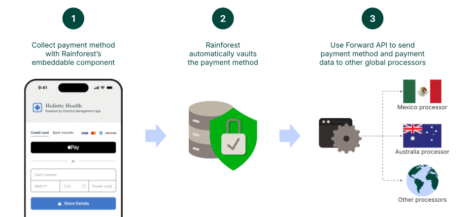 If a third-party is certified to receive sensitive payment method data, Rainforest can orchestrate global payments in 3 easy steps.