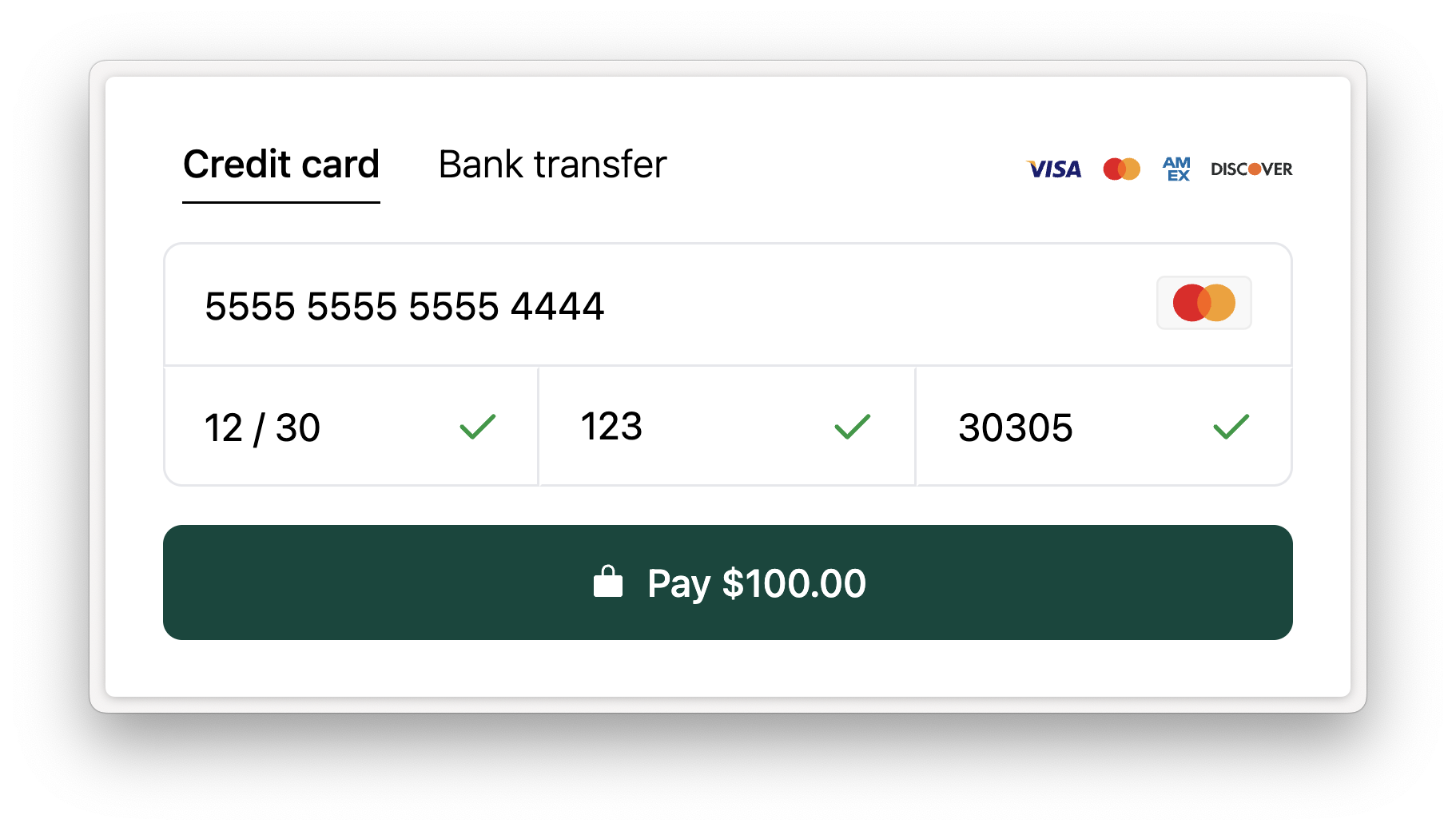 Once your merchant is onboarded and active, they can begin processing payments. The payment component collects sensitive payment data from your user without exposing your platform to the sensitive payment data - increasing security and decreasing PCI DSS scope.