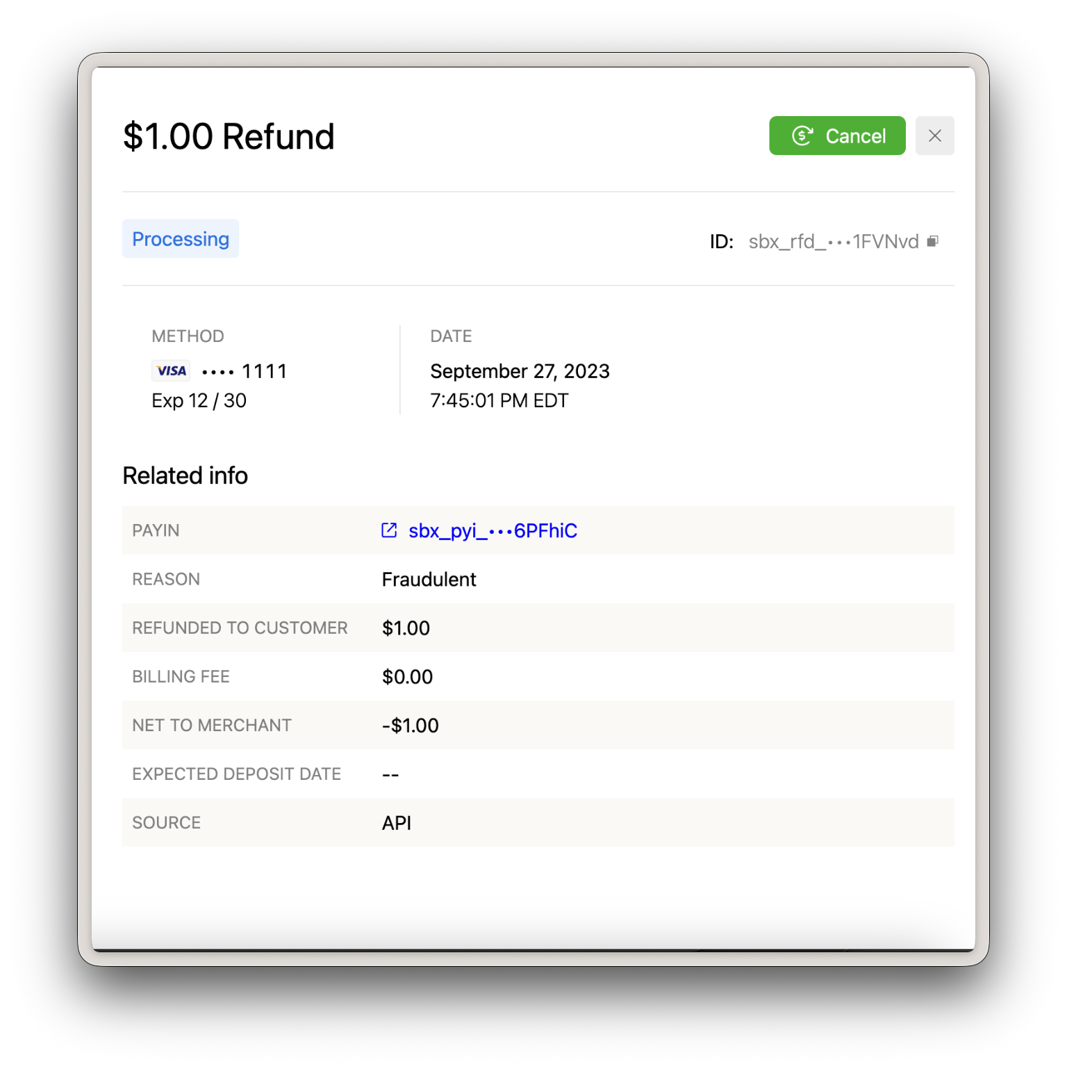 A refund can only be canceled while it is still eligible before settlement. If a refund is already canceled, the void request will fail, additionally the UI controls for canceling the refund will no longer be present. Platforms should treat this as a pre-settlement correction workflow, not as a way to reverse completed refund activity.
